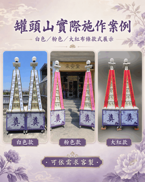 提供白色、粉色、大紅色奈米防水落款布條,可依往生者年齡、家屬需求與喪家習俗製作。