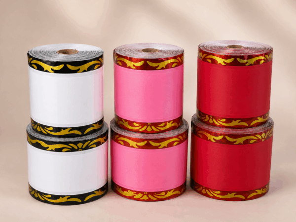 晨發商號使用奈米防水落款布條,顏色由左至右為白色、粉色、大紅色,布條邊緣搭配金色花紋裝飾,適合罐頭山、米塔與各式治喪供品使用。