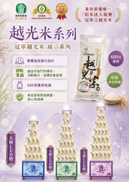 照片中的越光米塔,主打「實體盒版 600g / 包」,並搭配展示用盒、燈光塔架與底座。米包可交由主家作回禮、普渡或其他合宜用途,對重視實用與不浪費的家庭來說,是比單純裝飾型供品更容易被接受的選擇。